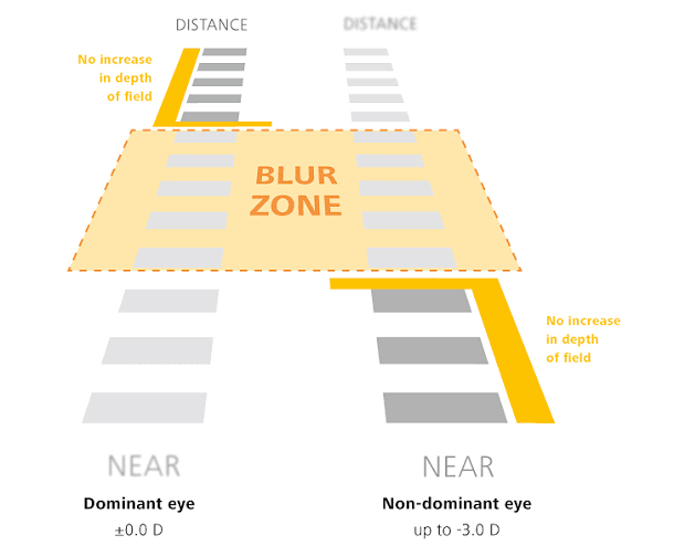 - One eye is corrected for mostly for distance and a little for near