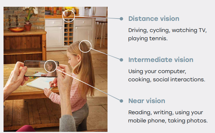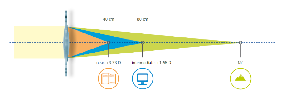 Multifocal lenses are aimed for distance in both eyes. Due to the rings and light splitting technology both eyes sees distance, intermediate and near. The advantage of multifocal lenses is that both eyes do not need to be focussed at different points..
