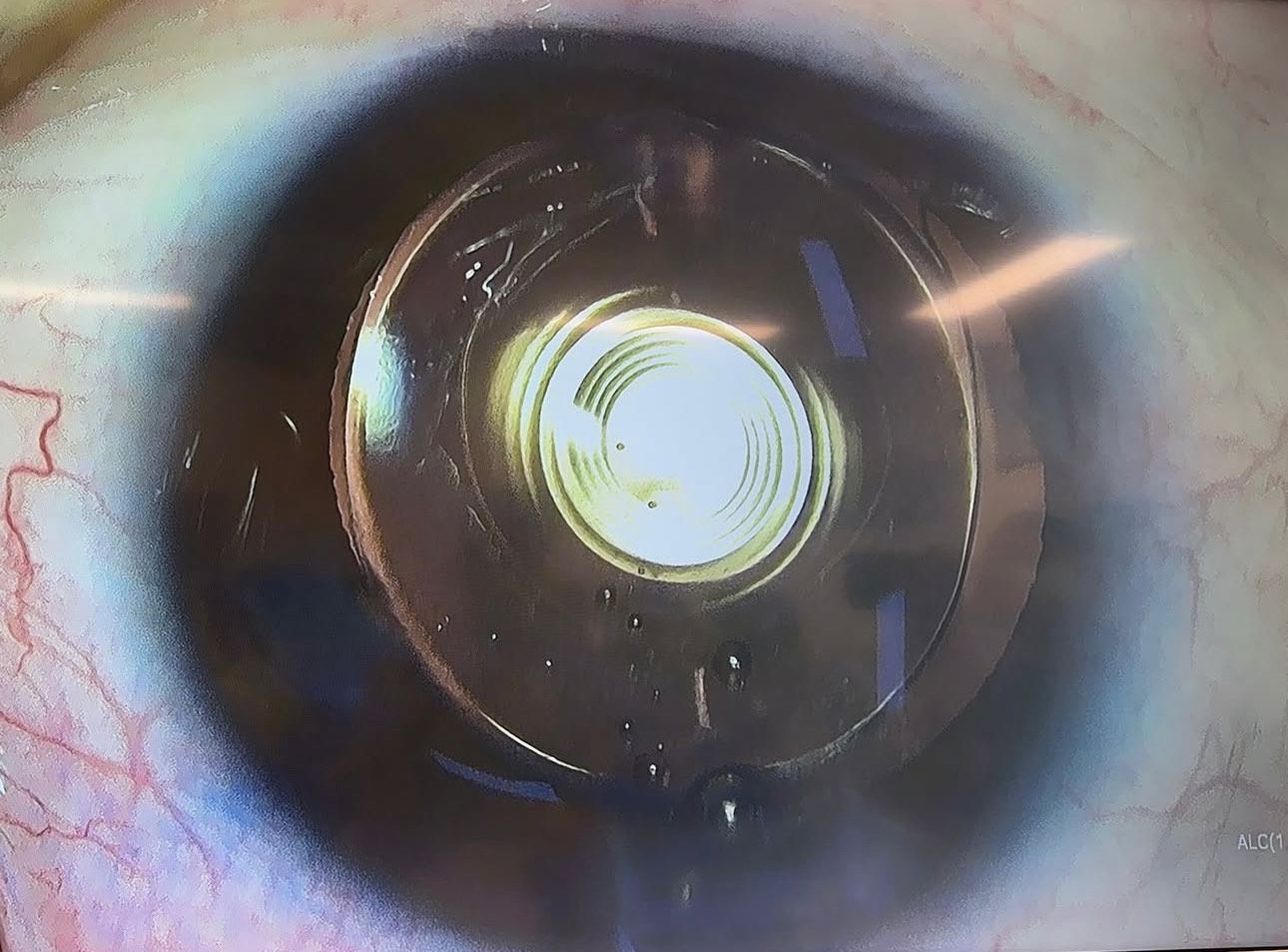 Multifocal lenses have rings (known as diffractive rings) in the lenses which splits light into 3 focal points, one for distance, one for intermediate and one for near vision.